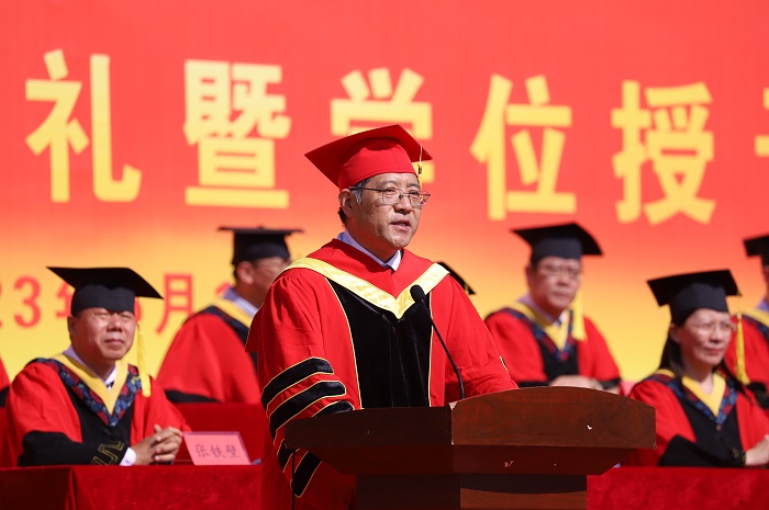 最后,学院党委副书记、校长张效松讲话。向2023届毕业生圆满完成学业表示热烈的祝贺,回顾了同学们极不平凡的四年大学生活以及学院的快速发展。张院长以“在磨砺中成长,在挑战中前行,在赓续奋斗中留下无悔青春”作为临别赠言,对毕业生同学们提三点希望。一是心怀“国之大者”,树立远大理想;二是做好“N种选择”,把好人生方向;三是永远脚踏实地,实干成就未来。希望同学们牢记习近平总书记殷切期望,适才择业、勤劳创业、踏实成业,争做时代弄潮儿,在实现中华民族伟大复兴第二个百年奋斗目标的生动实践中,书写绚烂的人生华章。