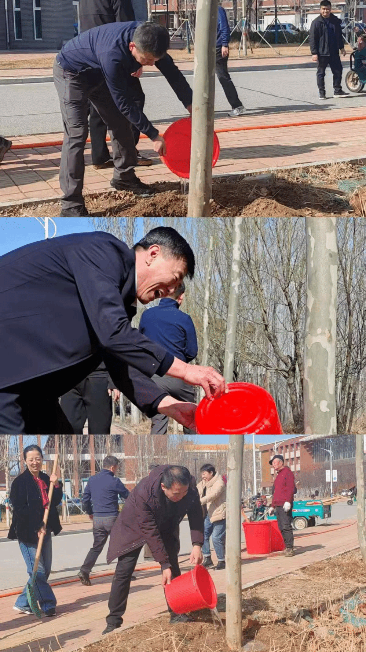活动现场,师生们在后勤管理处工作人员的指导下有序分工、协作配合,大家拿起铁锹、水桶等工具,投入到植树劳动中——挥锹铲土、扶正树苗、培实新土、提水浇灌,每个环节都做得认真细致。阳光下,师生们忙碌的身影成为春日校园里的一道风景。