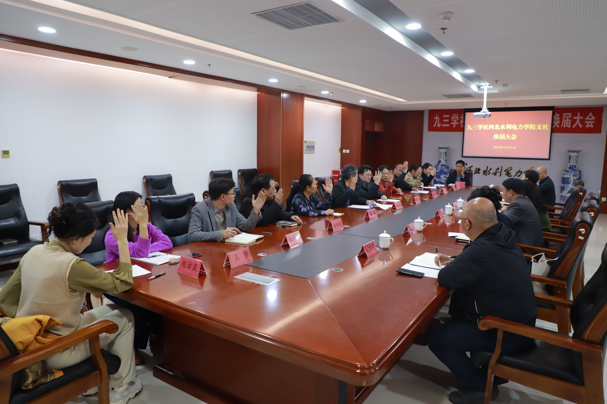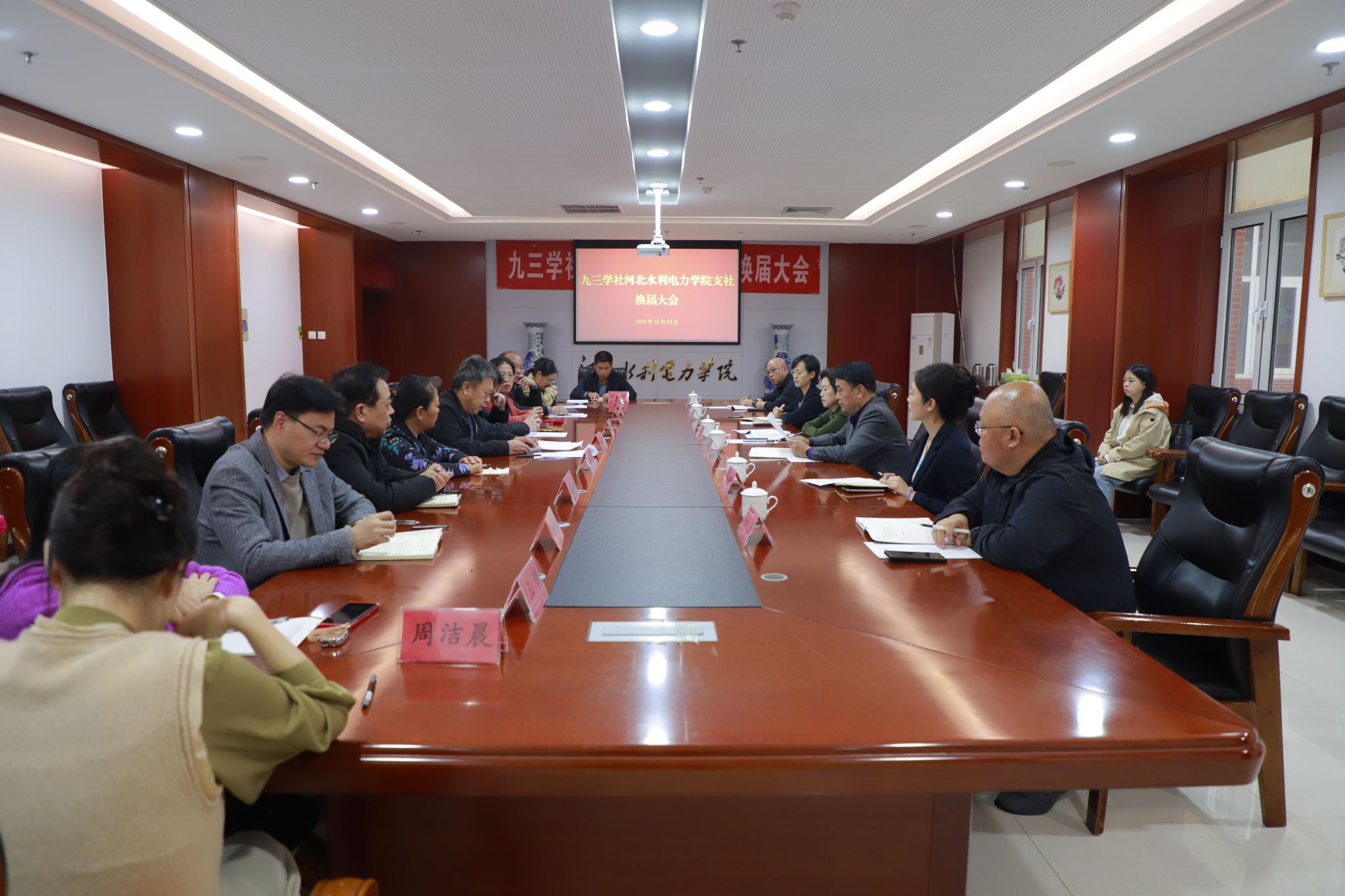 10月23日下午,九三学社河北水利电力学院支社在弘文守正楼1102会议室召开2025年换届选举大会。河北水利电力学院党委宣传部长、统战部长于书忠,九三学社沧州市委副主委王永梅、专职副主委王宏出席会议。会议由河北水利电力学院支社主委田国锋主持。