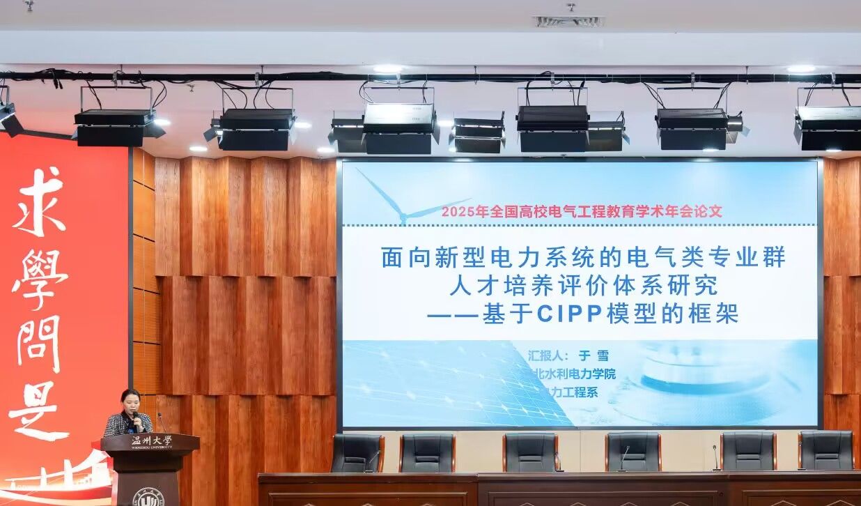 12月18日至21日,2025年全国高校电气工程教育学术年会在浙江温州召开。电力工程系李文才主任、于雪老师等应邀参会,会上,李文才、于雪分别以《数智赋能 高素质应用型人才培养实践》《面向新型电力系统的电气类专业群人才培养评价体系研究——基于CIPP模型的框架》为题作专题报告,向全国同行展示我校在应用型电气类人才培养方面的创新探索。