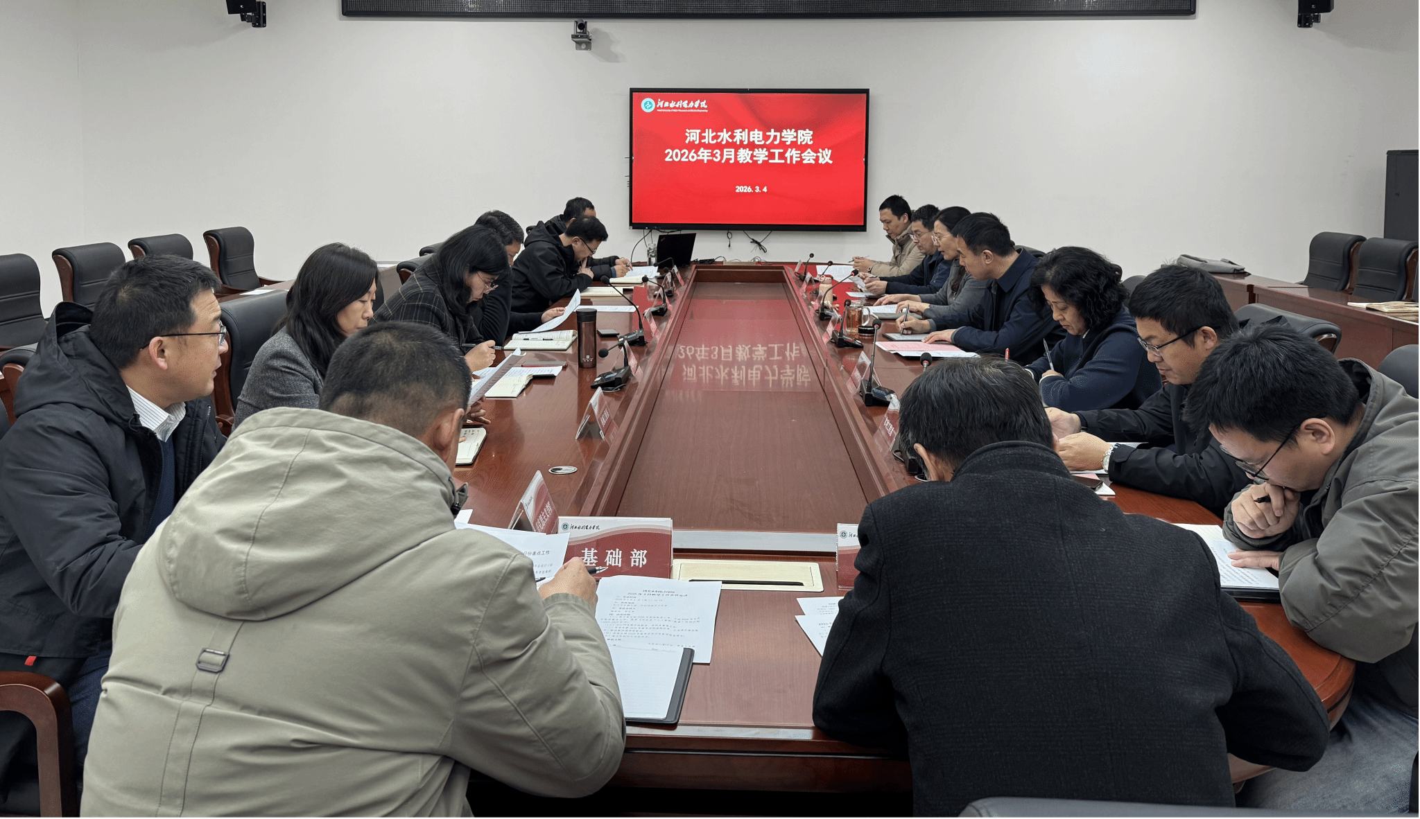 会上,贾冬青总结了寒假教学工作,介绍了3月份教学重点工作,领学了《河北省“人工智能+教育”行动计划(2025-2027)》。王以明布置了实践教学、学科竞赛等工作,李岩布置了2026年春季学期课程补考、公选课开课及选课工作,并对教师调停课要求进行了解读。徐艳反馈了2026年春季学期开学教学检查情况。