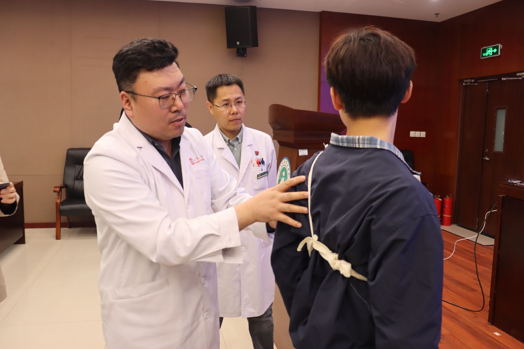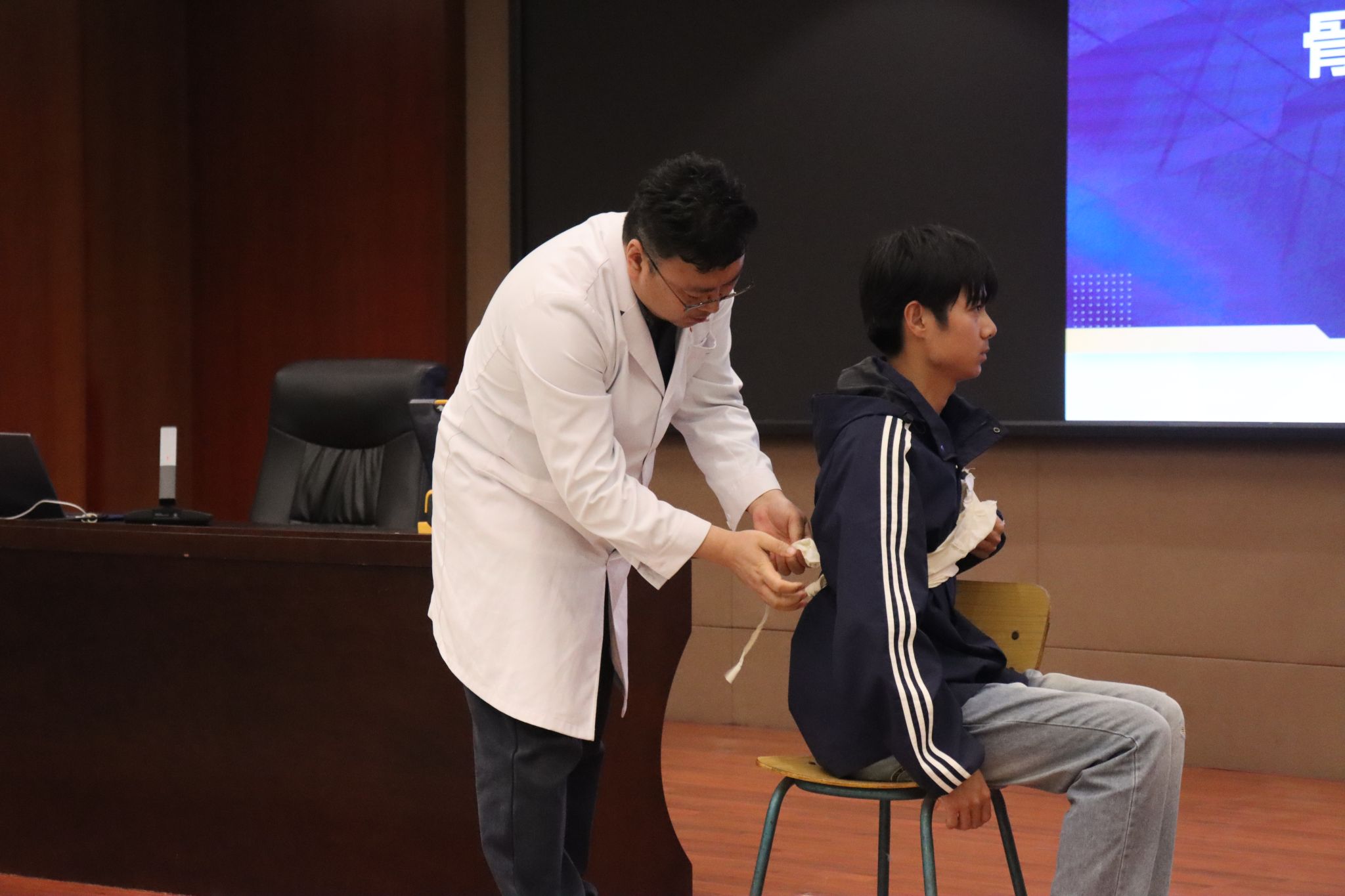 关节外科赵吉堂主治医师针对“小腿骨折固定”进行了讲解与实操。他通过模拟在山区环境下的急救场景,指导学生在缺乏专业设备的情况下,利用有限工具进行有效固定。赵医生详细演示了从判断伤情、检查神经血管功能,到选择夹板、超过关节固定,再到使用棉垫保护骨骼凸起处、包扎固定的完整流程。他还特别提到在特殊情况下,如何利用“健肢固定”的方法进行搬运,并再次强调了操作前后反复评估伤者神经血管状态的重要性。