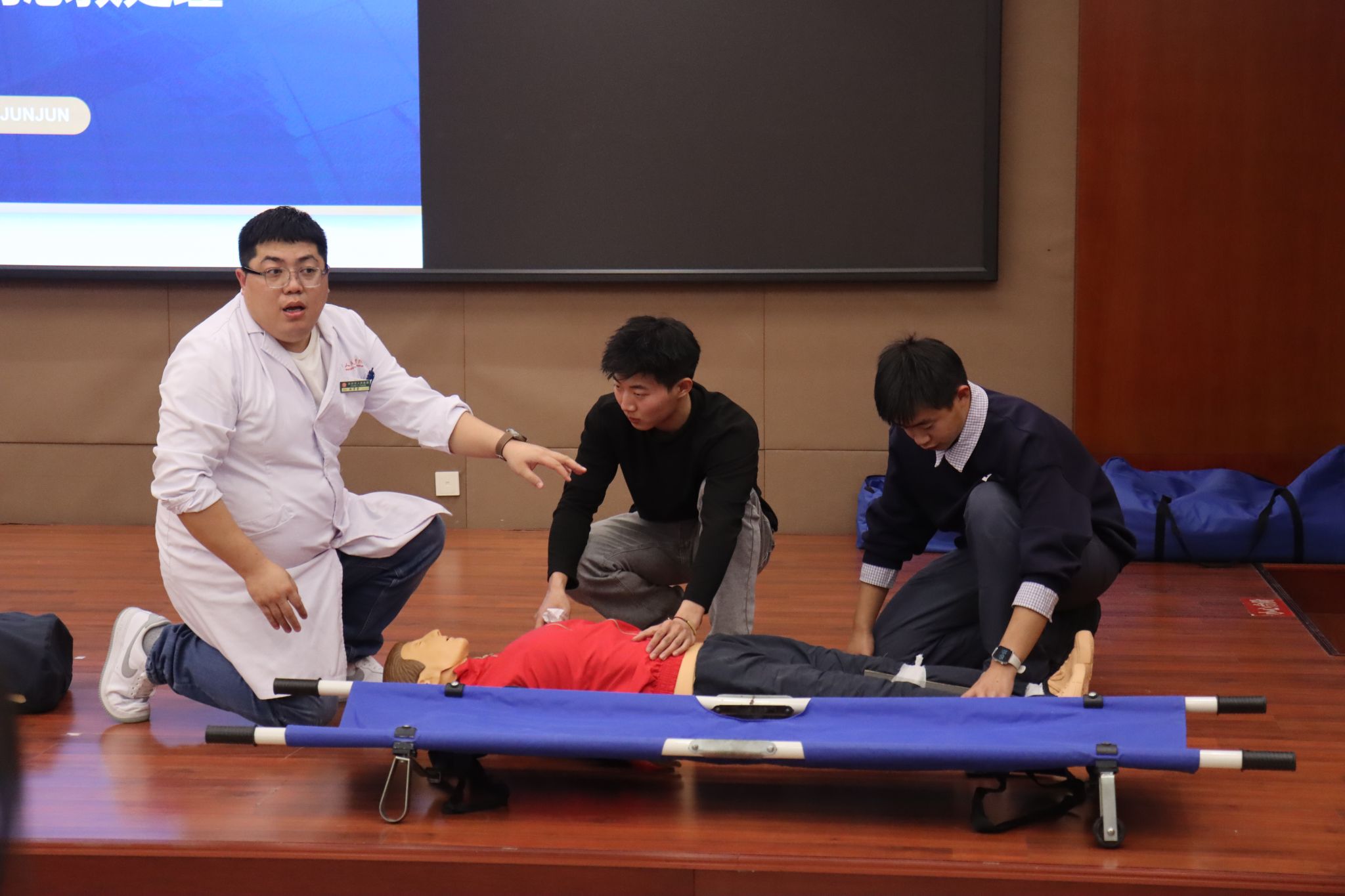 急诊科主管护师王勇、孙文旭两位医生为大家带来心肺复苏(CPR)与自动体外除颤器(AED)使用的专项讲解与实操演示。作为急救链条中最关键的一环,心肺复苏与AED的正确使用,直接关系到心脏骤停患者的生还概率。两位医生结合多年急诊一线工作经验,以真实案例为切入点,详细讲解了判断意识、呼叫求助、胸外按压、开放气道、人工呼吸以及AED设备的操作流程与注意事项。讲解过程中,他们利用人体模型进行现场演示,让同学们切实体会到“黄金三分钟”的紧迫感与施救的科学性。