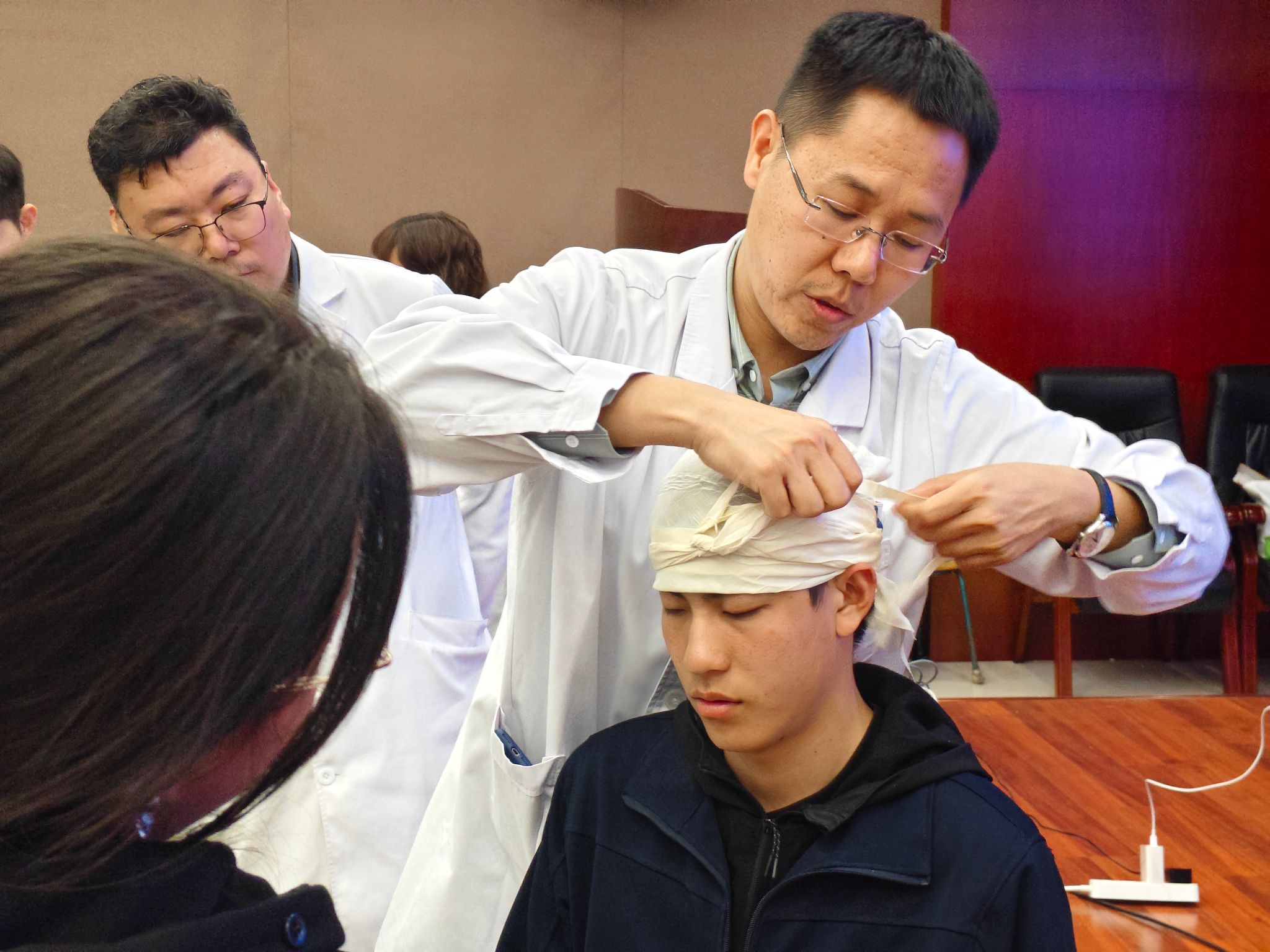 讲座伊始,神经外科王玉华副主任医师围绕“头部伤口包扎”进行了专业讲解与示范。他首先强调了在处理头部伤情时判断伤者意识的重要性,特别是对于昏迷患者,需保证其呼吸道通畅,将头部偏向一侧。随后,王医生详细演示了使用三角巾进行头部包扎的标准流程,从冲洗伤口、放置敷料,到如何正确固定、调节松紧,并反复提醒操作过程中应注意人文关怀,如向患者说明情况、询问感受等,确保施救过程安全、有效且充满温度。