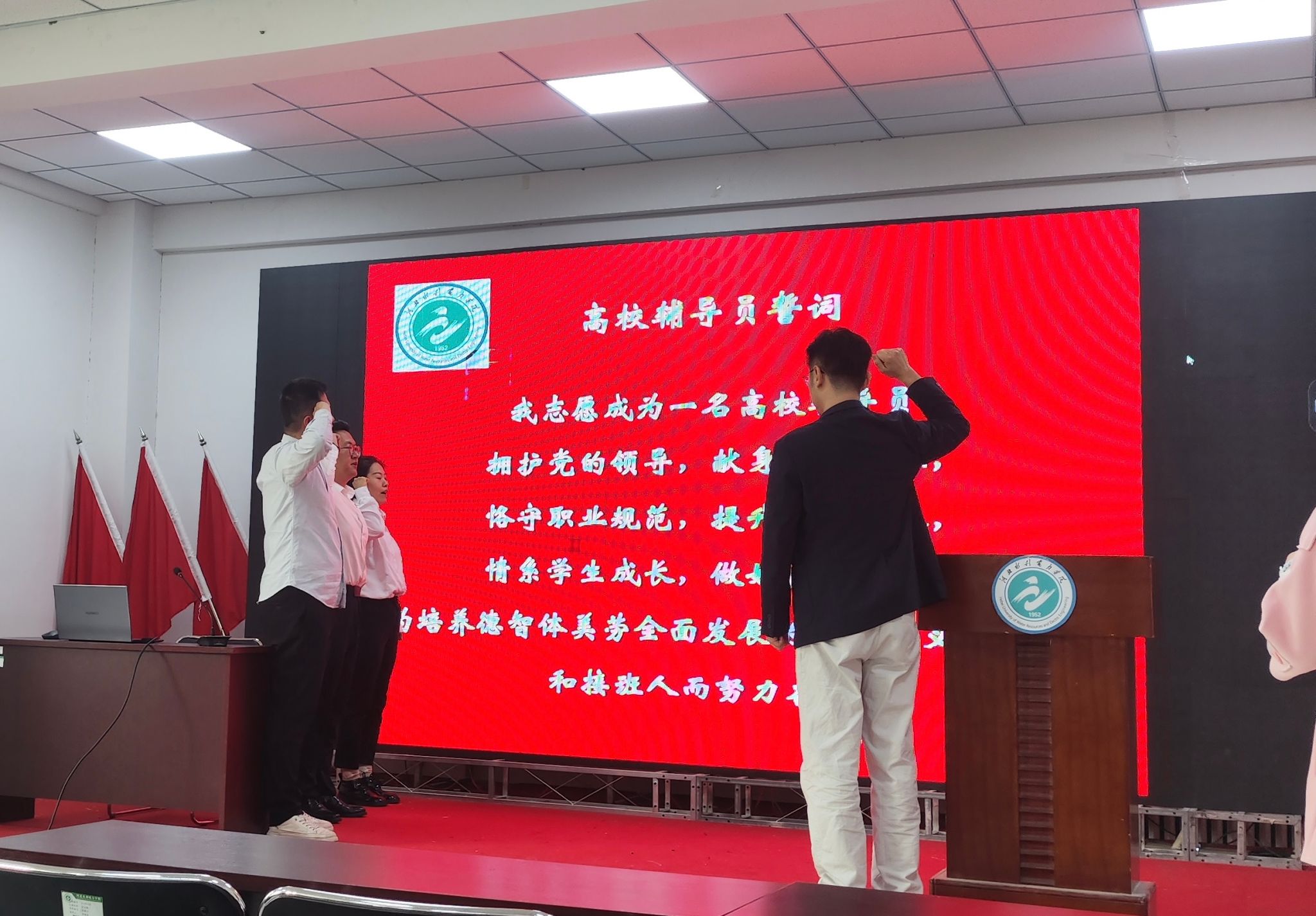 讲座前,三名新任辅导员紧握右拳,庄严宣读辅导员誓词,表达了牢记为党育人、为国育才使命的坚定决心。