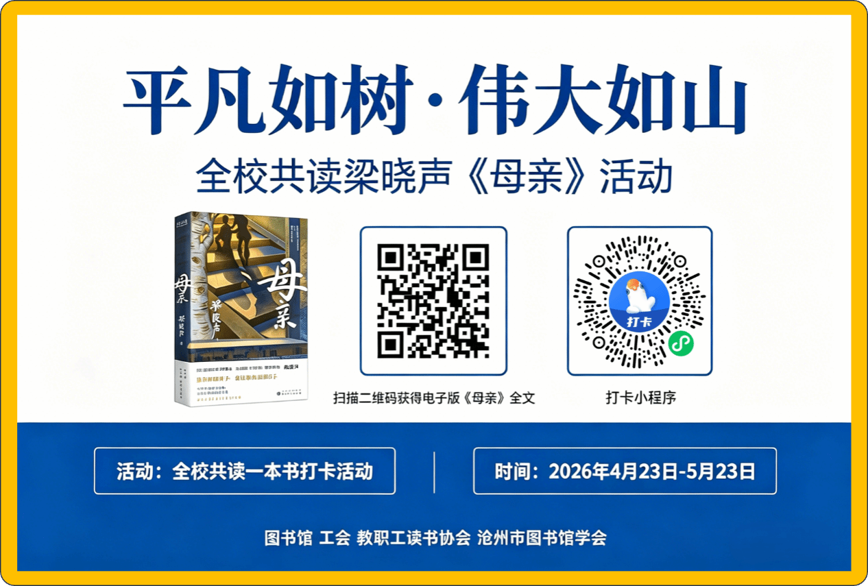 为深入贯彻习近平总书记“推动全民阅读,建设书香社会”的重要指示精神,值此第31个“4·23世界读书日”之际,由我校图书馆与校工会联合主办、教职工读书协会与沧州市图书馆学会协办的“平凡如树·伟大如山”——全校共读一本书启动活动,于4月23日在图书馆二楼会议室举行。活动采用线上线下相结合的方式,吸引了众多师生共同参与。